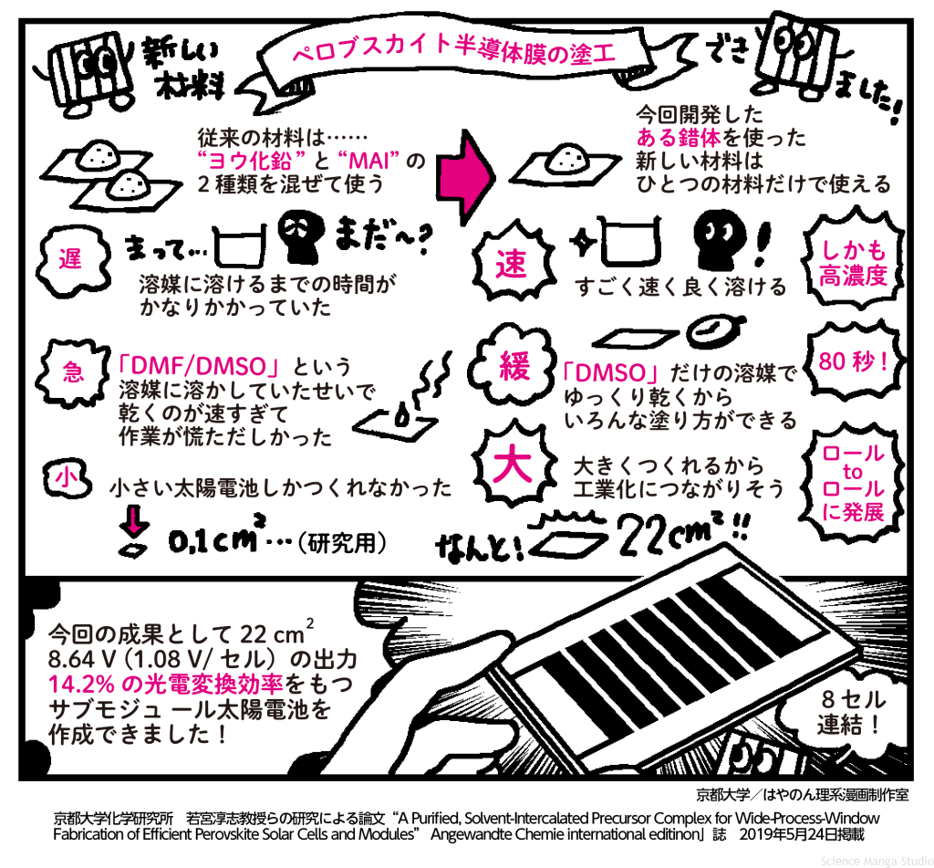 若宮淳志 化学研究所 教授、リチャード・マーディ 同助教、 アルワニ・イマナ・ラフィー 同博士研究員、 尾﨑雅司 工学研究科博士課程学生、時任宣博 同教授、村田靖次郎 同教授、笹森貴裕 名古屋市立大学 教授、 ピヤシリ・エカナヤケ ブルネイ・ダルサラーム大学 博士らの研究グループのプレスリリース図を理系漫画制作室が制作し提供しました。