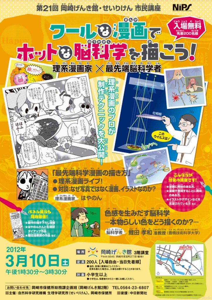 生理学研究所出身の脳科学研究者・鯉田孝和准教授(豊橋技術科学大学)と共に「理系漫画で、最先端脳科学をわかりやすく伝える方法とその魅力」について、実際の漫画をお見せしながら、理系漫画ライブと題して、講演を行いました。