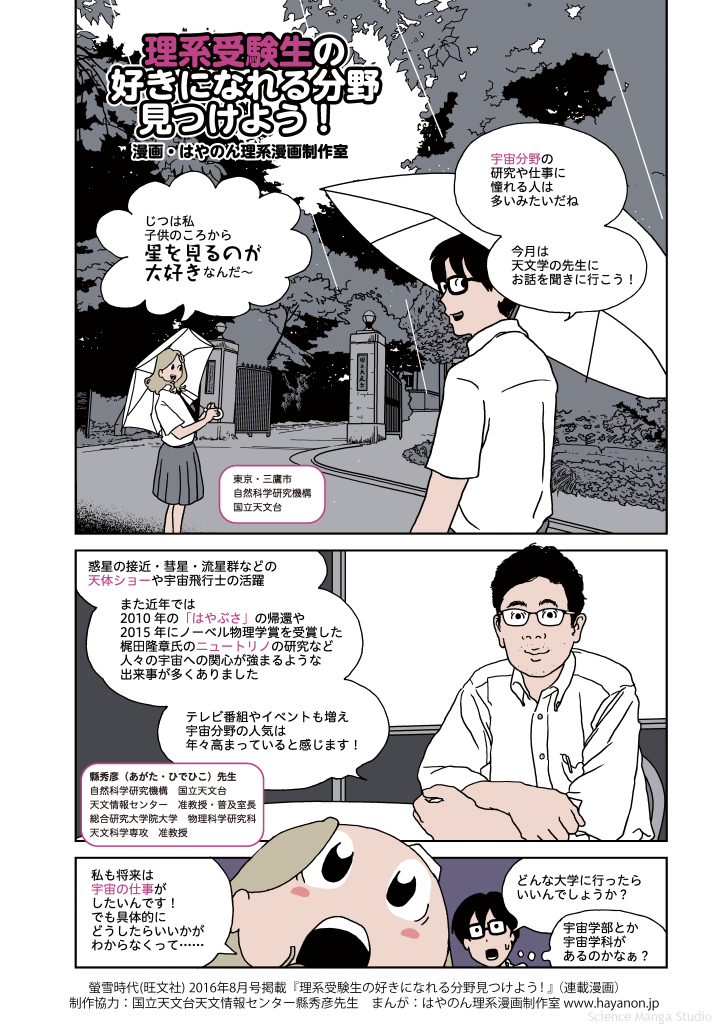 『螢雪時代』2015年5月号〜11月号(旺文社)に、漫画「理系受験生が好きになれる分野見つけよう!」を掲載しました。